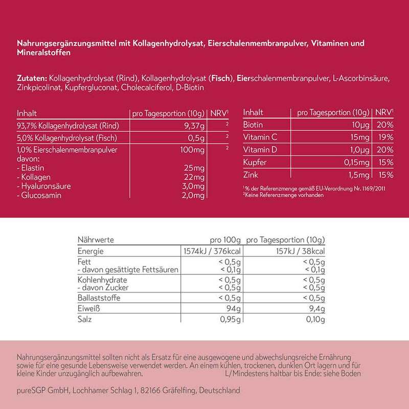 Kollagenhydrolysat (Rind), Kollagenhydrolysat (Fisch), Eierschalenmembranpulver, L-Ascorbinsäure, Zinkpicolinat, Kupfergluconat, Cholecalciferol, D-Biotin.