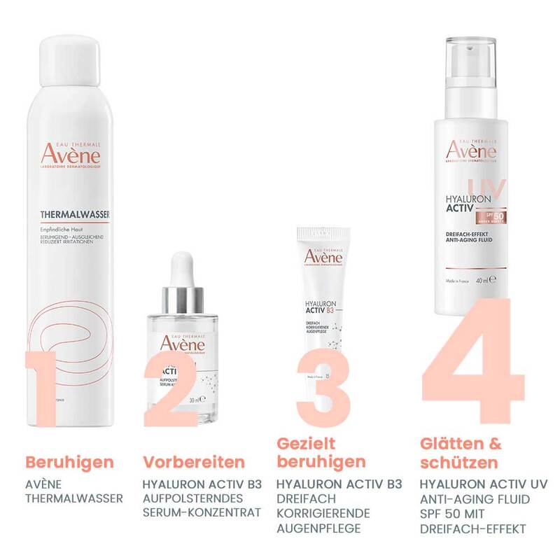 - Tagespflege mit Dreifach-Effekt: Anschließend das Avène Hyaluron Activ UV Anti-Aging Fluid SPF 50 auf Gesicht, Hals und Dekolleté auftragen.