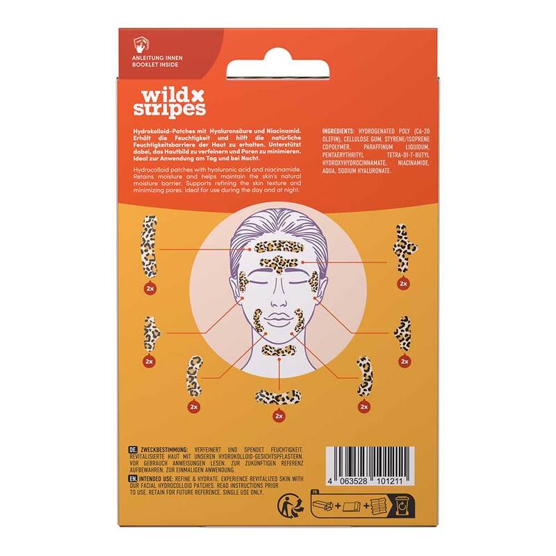 Die Facial Patches Leo von Wild Stripes sind nicht nur ein optisches Highlight, sondern auch eine gezielte Pflege für die Haut. Angereichert mit Hyaluronsäure und Niacinamid, können die Hydrokolloid-Pflaster dabei helfen, die natürliche Feuchtigkeitsbarriere der Haut zu bewahren. Sie können dazu beitragen, das Hautbild zu verfeinern und die Poren sichtbar zu minimieren. Dank ihres stylishen Leo-Musters können die Patches sowohl tagsüber als modisches Statement als auch nachts zur intensiven Pflege getragen werden. So wird die Haut mit Feuchtigkeit versorgt und erhält ein ebenmäßigeres Erscheinungsbild.