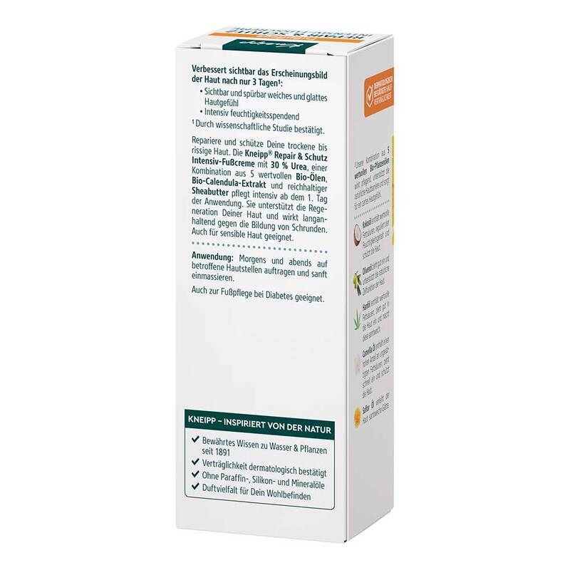Die Kneipp Repair & Schutz Intensiv-Fußcreme mit 30 % Urea, einer Kombination aus 5 wertvollen Bio-Ölen, Bio-Calendula-Extrakt und reichhaltiger Sheabutter pflegt intensiv ab dem 1. Tag der Anwendung und unterstützt die Regeneration der Haut.