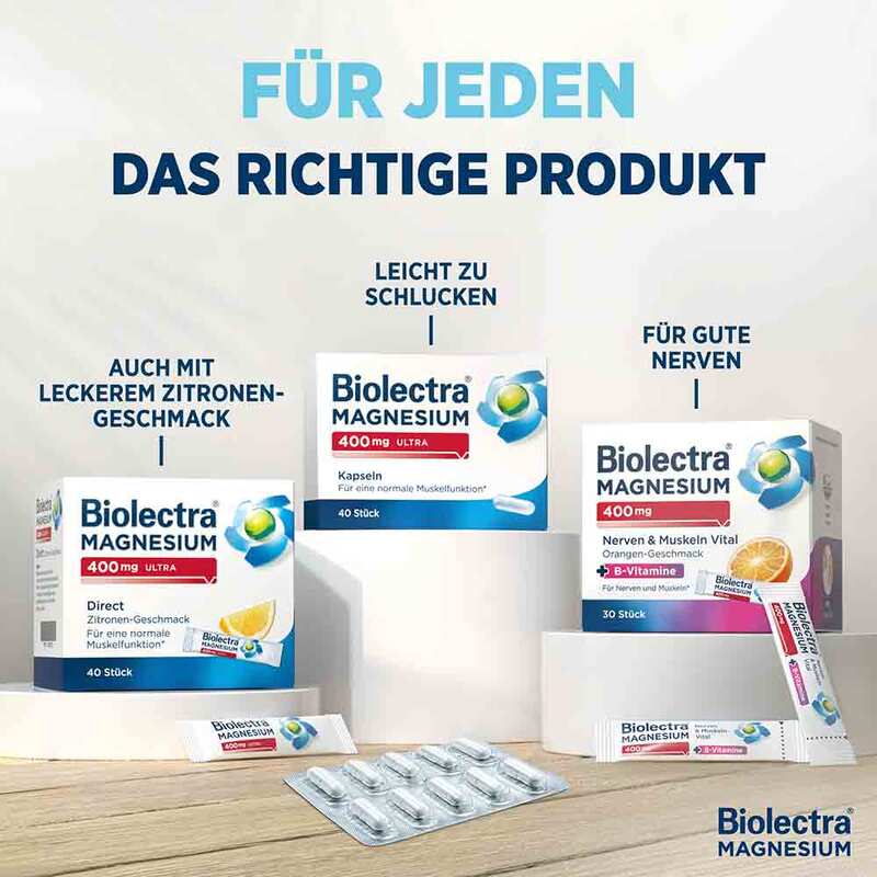 Die moderne Magnesium-Versorgung: Biolectra Magnesium 400 mg ultra Direct ist die zeitgemäße und praktische Magnesium-Versorgung, mit der man seine Magnesium-Speicher einfach wieder auffüllen kann. Dank der besonderen Darreichungsform als Micro-Pellets d. h. als kleine Kügelchen kann Biolectra Magnesium 400 mg ultra Direct ohne Flüssigkeit eingenommen werden. Ein Stick Biolectra Magnesium 400 mg ultra Direct trägt zur Deckung eines erhöhten Magnesiumbedarfs bei. Einfacher und bequemer geht es kaum. Biolectra Magnesium 400 mg ultra Direct eignet sich besonders gut für Menschen, die beruflich oder privat viel unterwegs oder sportlich aktiv sind. Denn auf Reisen oder beim Sport hat man nicht immer ein Glas Wasser griffbereit.