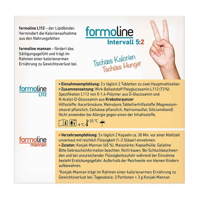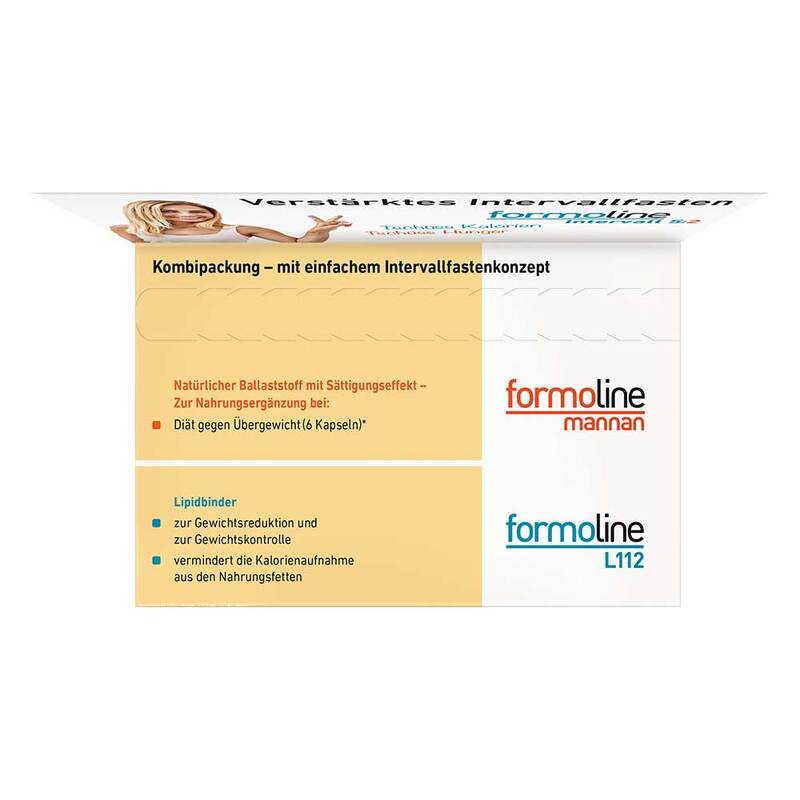 Die Formoline Kombipackung Intervall 5:2 ist ideal für die Unterstützung beim Abnehmen durch Intervallfasten entwickelt worden. Sie besteht aus Formoline L112, welches zum Essen eingenommen wird, und Formoline mannan, welches an Fastentagen Anwendung findet.