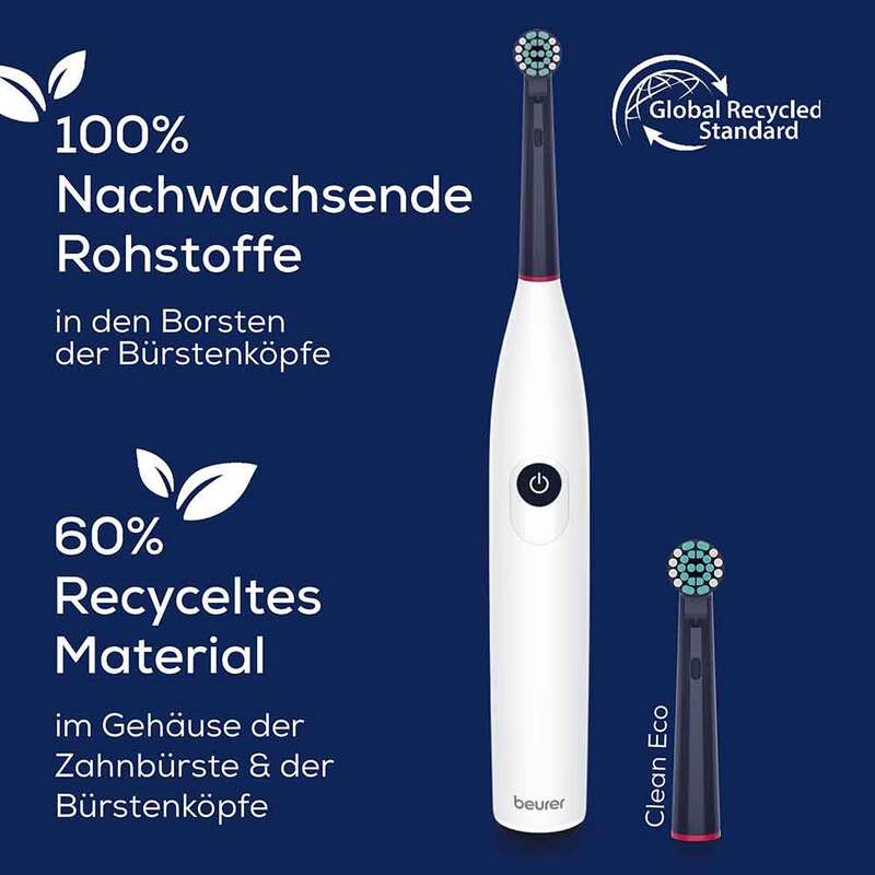 Mit 2 Reinigungsprogrammen, 2-Minuten-Timer und 12 Tagen Akkulaufzeit ist die elektrische Zahnbürste dein idealer Alltags-Begleiter. Gehäuse der Zahnbürste und der Bürstenköpfe bestehen zu 60 % aus recyceltem Material, die Borsten aus 100 % nachwachsenden Rohstoffen.